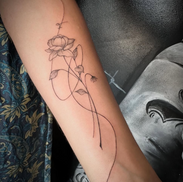 Spécialisée en fine line, ornemental et minimalisme, Kelly apporte une touche de délicatesse et de précision à chacun de ses tatouages.
